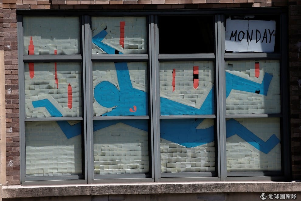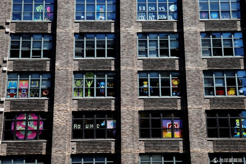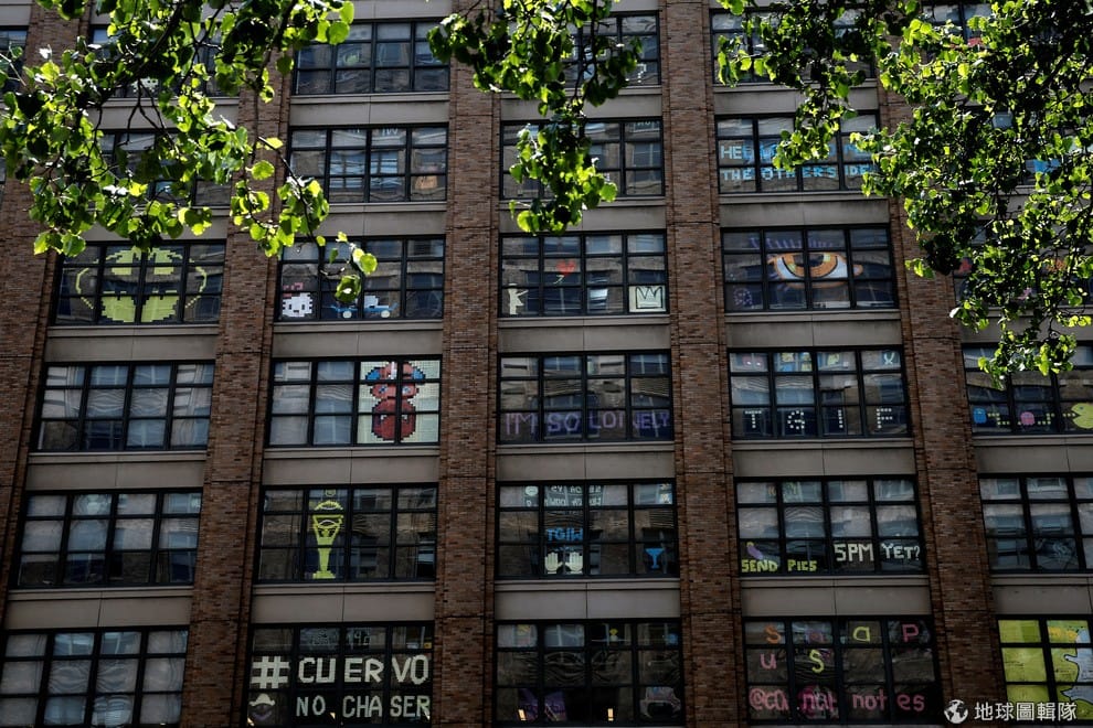 紐約堅尼街兩邊的大樓打起了便利貼大戰,馬路其中一側的大樓窗戶上可以看到各種創意的便利貼藝術。