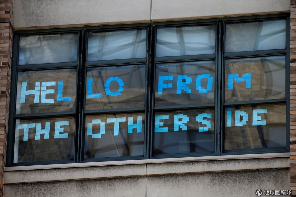 路透社員工用便利貼出字樣,跟對側大樓打招呼。