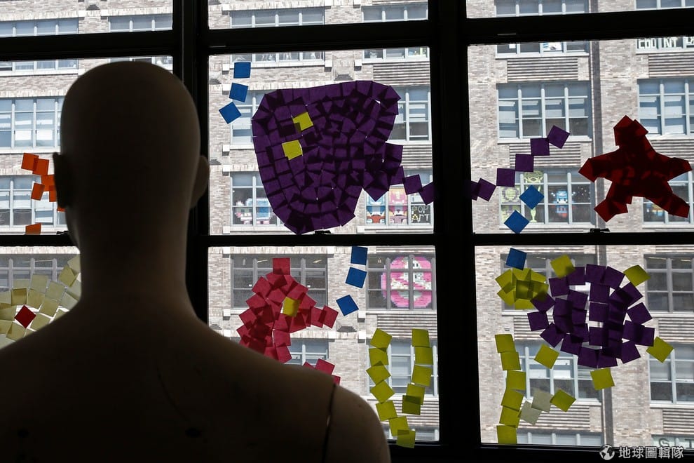 路透社五顏六色的便利貼在玻璃窗上,製造出活潑的海底世界。