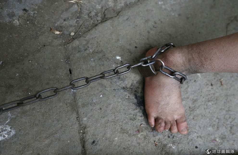 一條鐵鍊綁住罹患精神病的中國孩童,他的家人為了避免他攻擊別人,不得已只好綁住他。在中國缺乏醫療資源的鄉間,不少精神病患者無法就醫,在沒有獲得妥善照顧下精神健康越來越差。