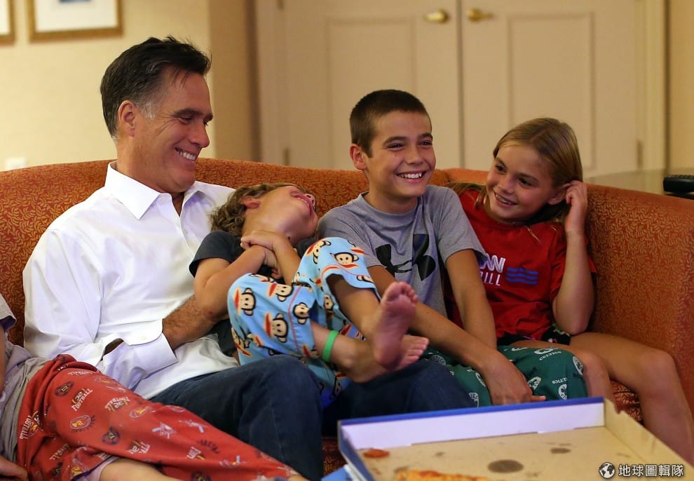 正在跟他的孫子們一起看電視的羅姆尼,他在家庭關係上一直給外界有不錯的印象。圖片來源:Justin Sullivan/Getty Images