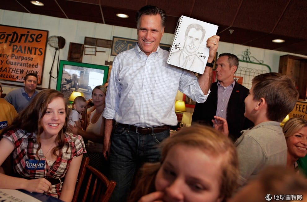 競選活動中在一家餐廳用餐的羅姆尼,碰上支持者幫他畫的肖像畫,他高興地舉在臉旁邊。圖片來源:Chip Somodevilla/Getty Images