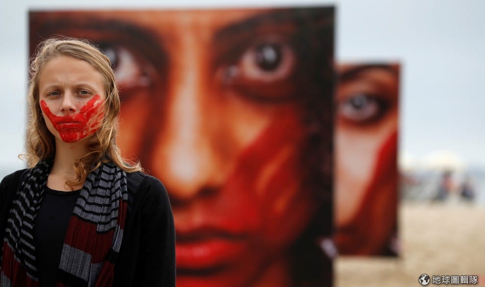 抗議強暴的女子用鮮紅掌印蓋住嘴部表達不滿。