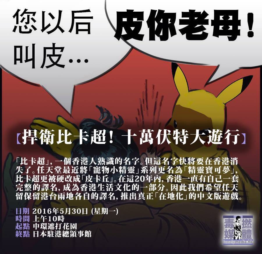 網友毒撚媒體LonelyMedia30號這天,不滿比卡超更名的民眾上街抗議,他們要任天堂公司入境隨俗,使用港人熟悉的譯名。