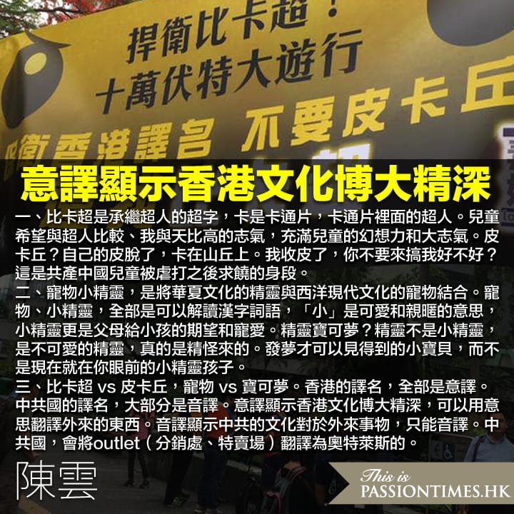 粉絲團成員深亮(音譯,Sing Leung)表示:「(比卡超)這個譯名呼應廣東話發音,已經在香港用了 20年,充分體現了香港文化。」