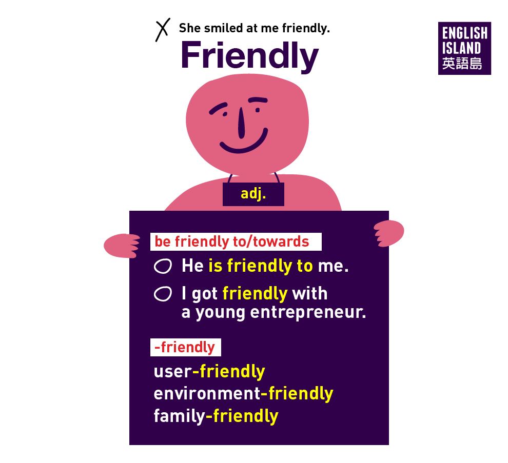 Friendly近幾年來流行一種用法,是把friendly放在名詞後面,像user-friendly、environment-friendly、family friendly。"-friendly可以解釋成「有利、方便、適合」的意義。例如: