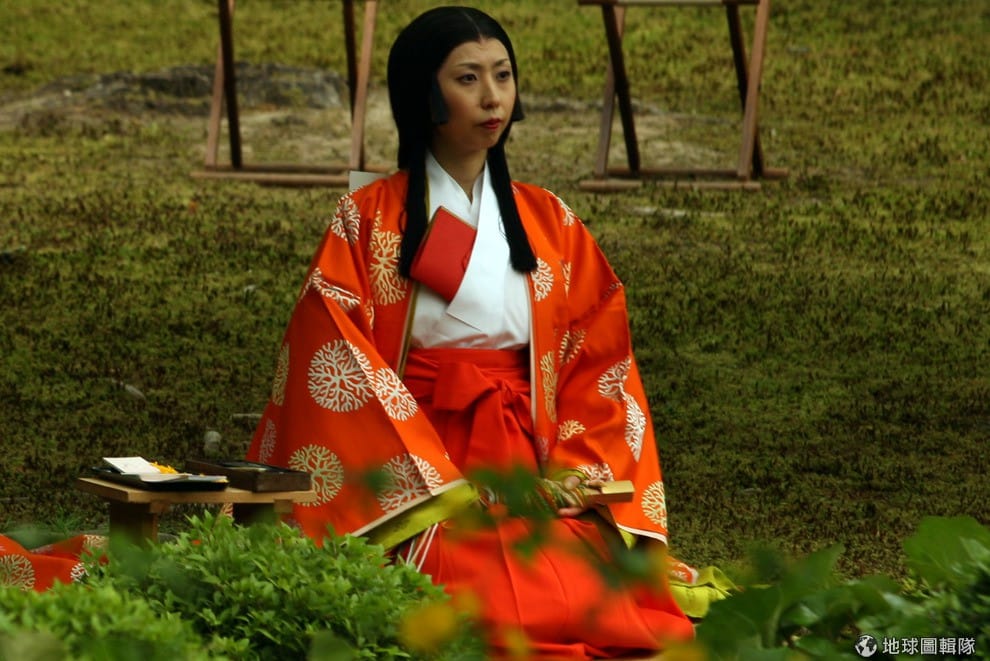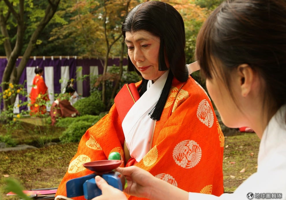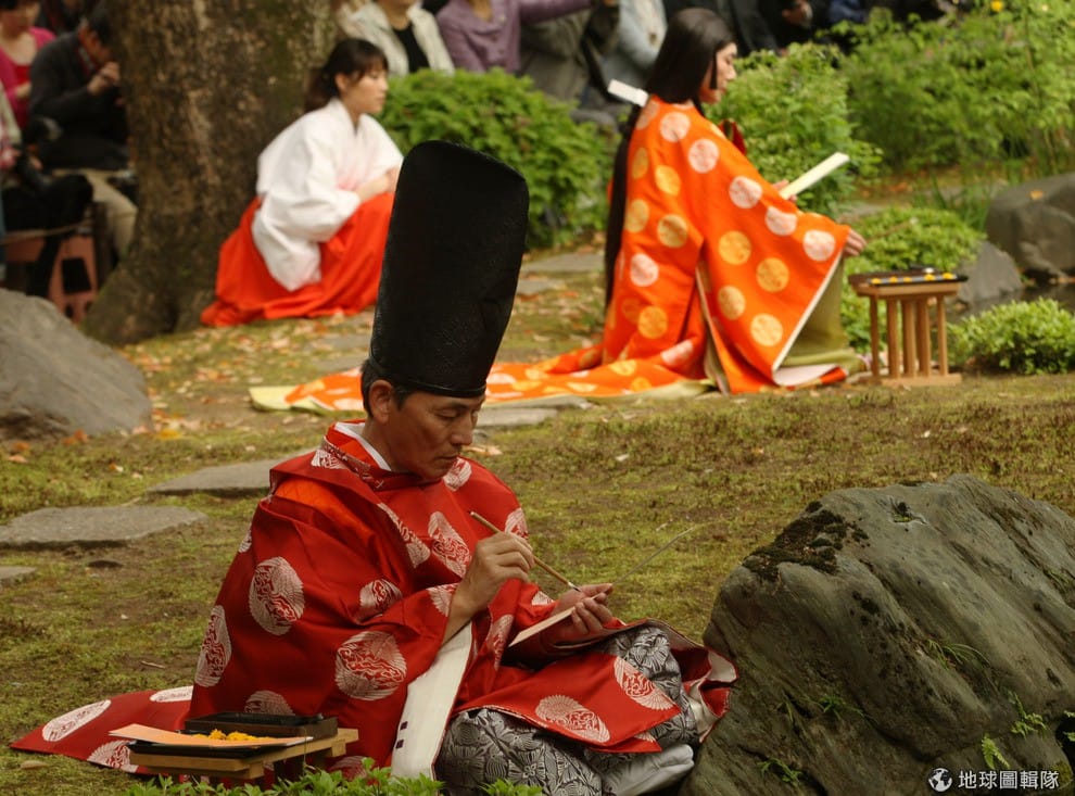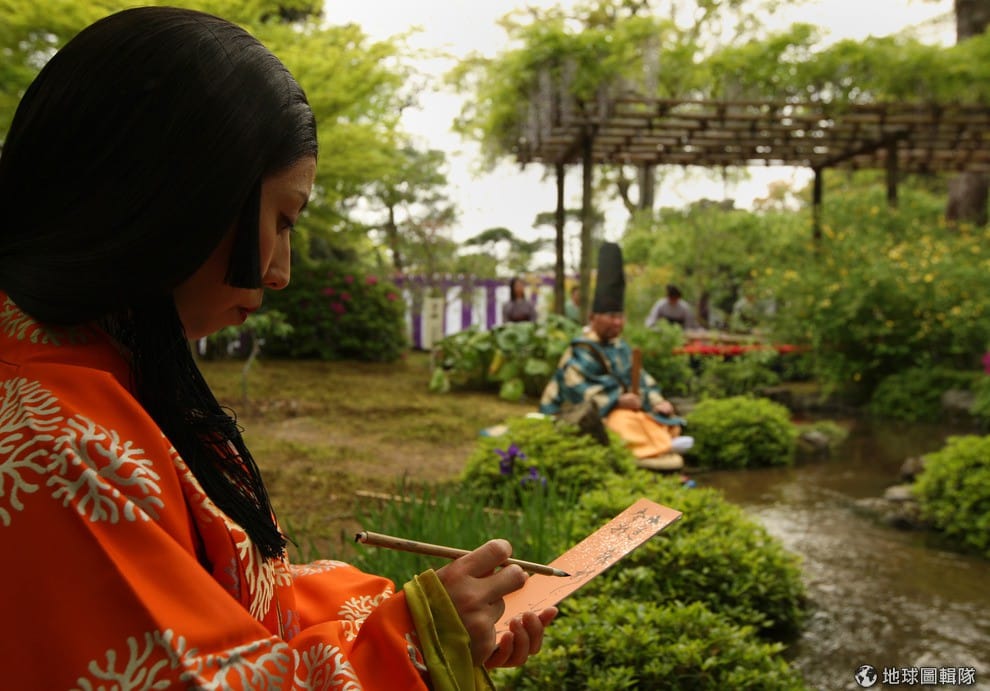 身穿日本平安時代貴族服裝的女子,在城南宮的庭園內寫起俳句。Buddhika Weerasinghe/Getty Images