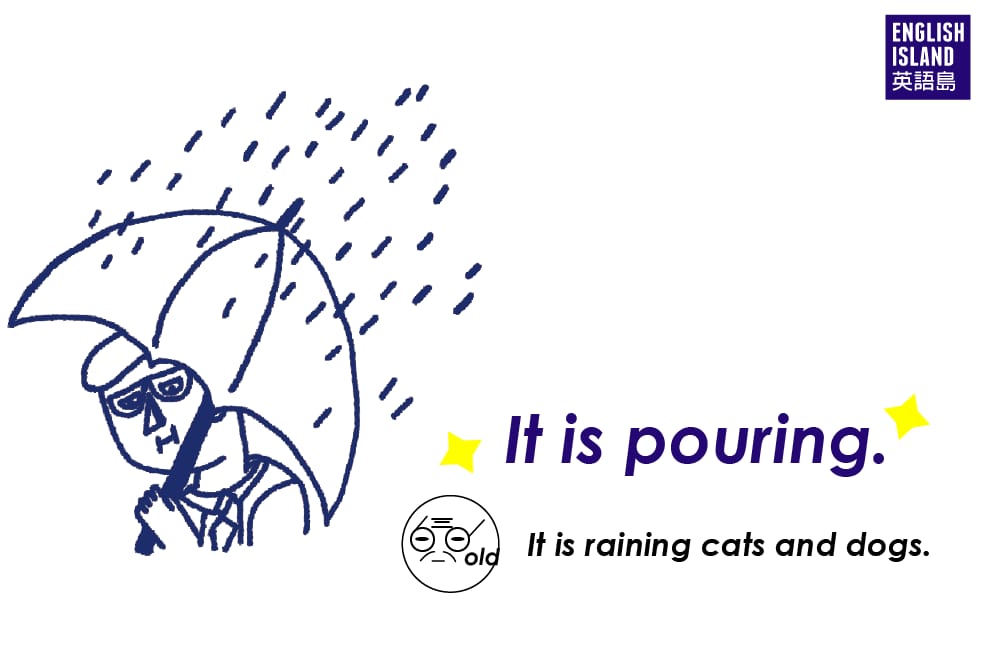 這句很有形象,也經常出現在英文的教科書上,其實老外現不太這麼用了。雨下得很大,直接用“It is pouring.”雨水像倒的一樣,注意,pour的發音是 [por]。或者更白話,就說:It’s raining really hard.