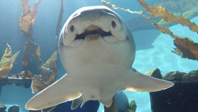 上圖是澳洲虎鯊,可以發現牠的牙齒相當特別不如我們往常所想的尖牙利齒,學者指出澳洲虎鯊牠們多是用敲碎的方式攝食貝殼類生物。