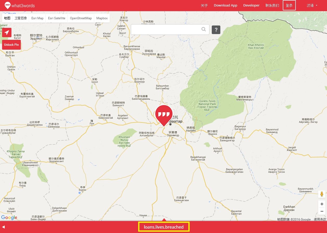 網友What3Words透過What3Words的「三字地圖系統」,蒙古烏蘭巴托國際機場的地址被縮成底下黃框中的三個單字「loans.lives.breached」。