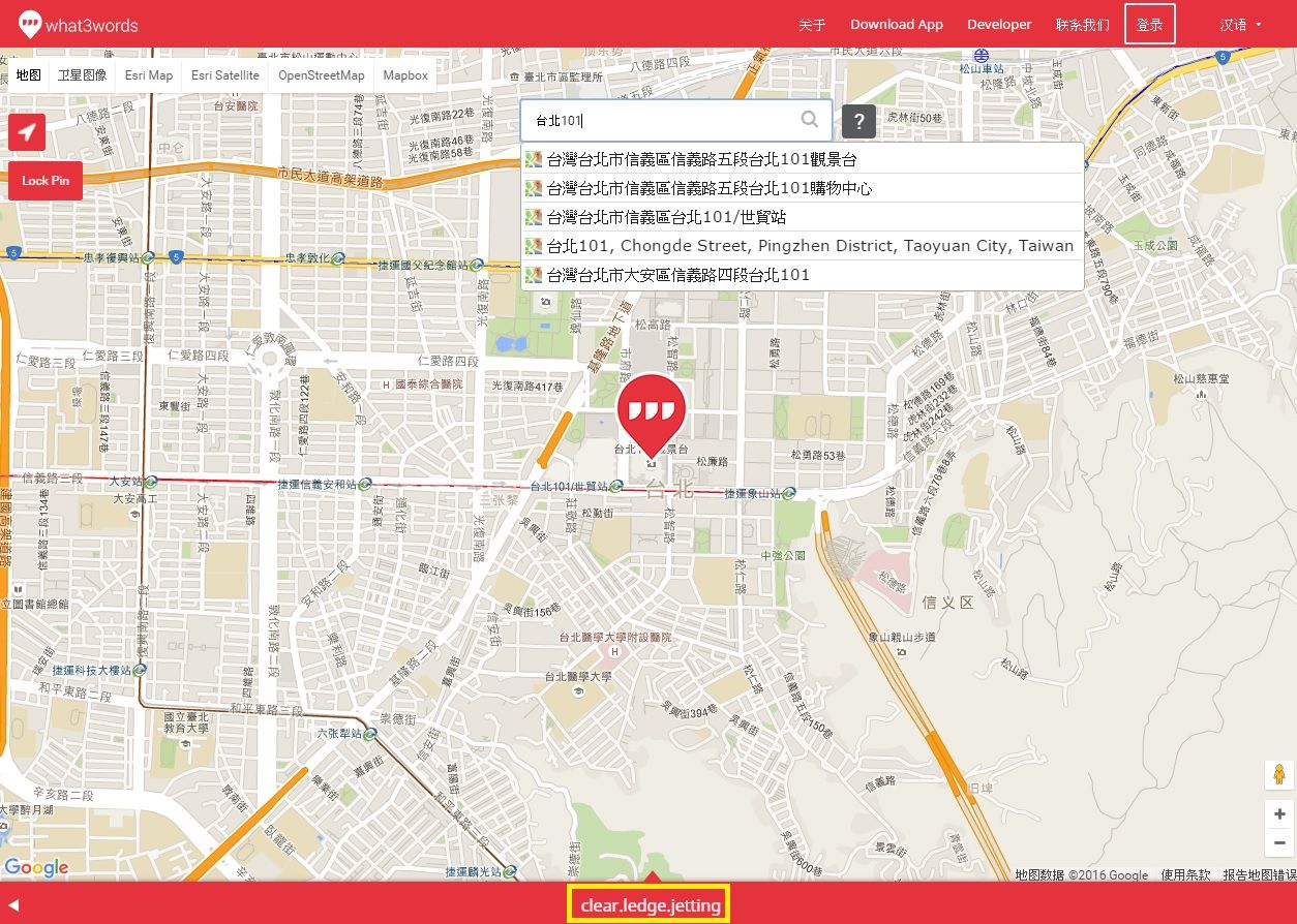 在What3Words研發的地圖系統中,台北101的地址如黃框中的三個單字:「clear.ledge.jetting」。