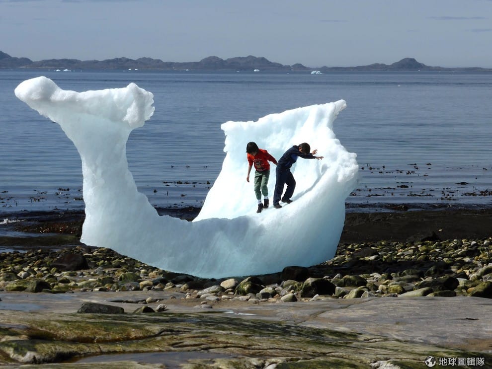 格陵蘭首府努克(Nuuk)當地,小朋友們正在巨大的冰塊旁玩耍。「格陵蘭」的意思為「綠色土地」,是丹麥王國的海外自治領地,在 2008年的公投後決定逐漸走向獨立之途,並在 2009年正式改制,成為一個內政獨立但外交、國防與財政相關事務仍委由丹麥代管的過渡政體。
