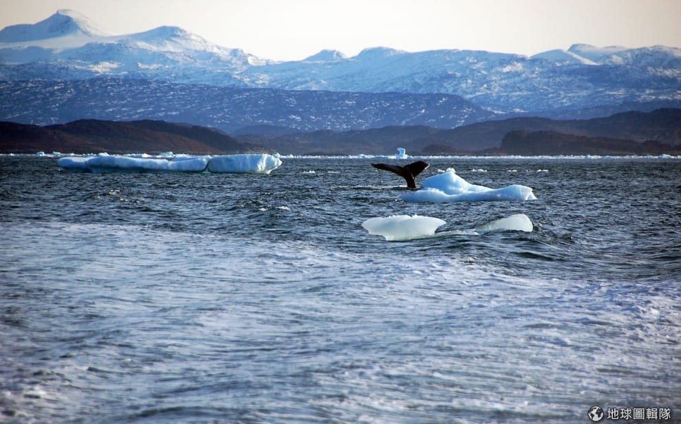 路透社格陵蘭首府努克附近海面,一隻鯨魚尾巴躍出水面。