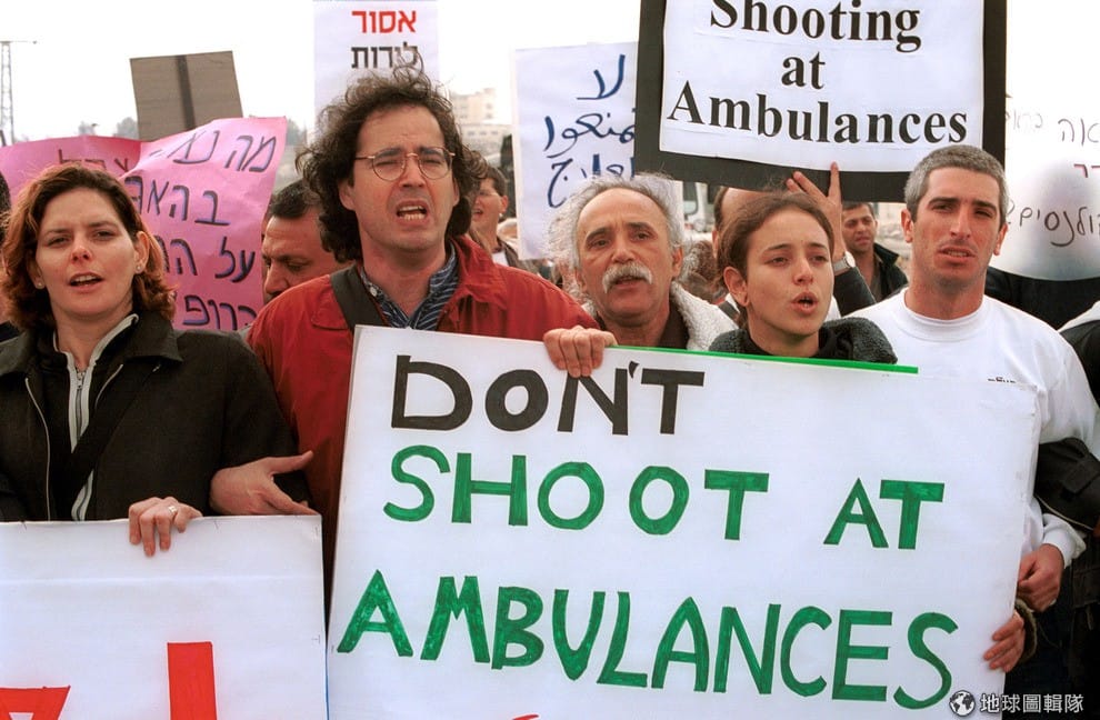 紅十字會超越了國界、種族,希望能用中立的方式幫助任何需要幫助的人。照片中是向以色列政府示威的人道團體,他們要求軍人不要對救護車開槍。