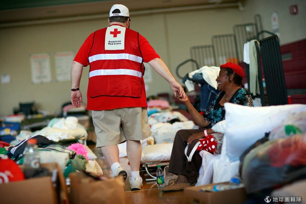 2011年颶風侵襲阿拉巴馬州,許多居民流離失所。照片中志工正在幫住在臨時收容所的災民打氣。