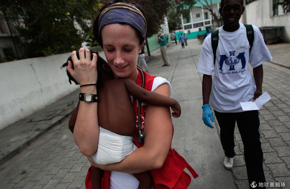 2010年海地發生嚴重的大地震,數千人死亡。照片中的志工正抱著海地的小朋友。
