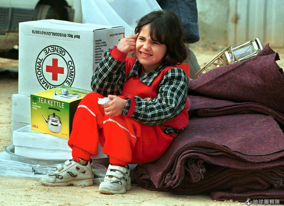 9歲的亞拉坐在毛毯上跟攝影師做鬼臉,2002年當地因為戰爭有許多居民失去家園。