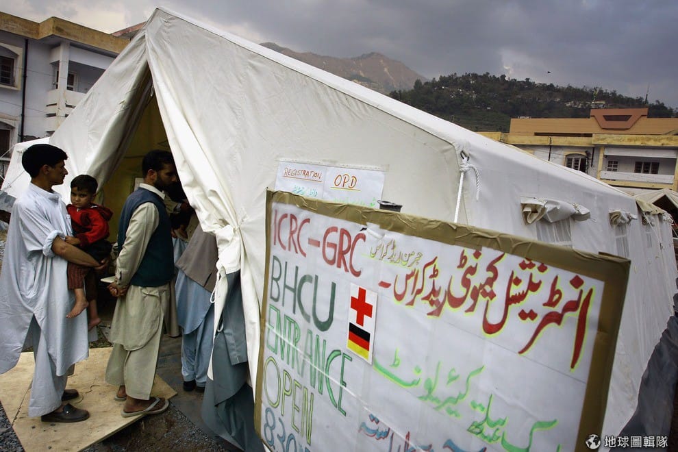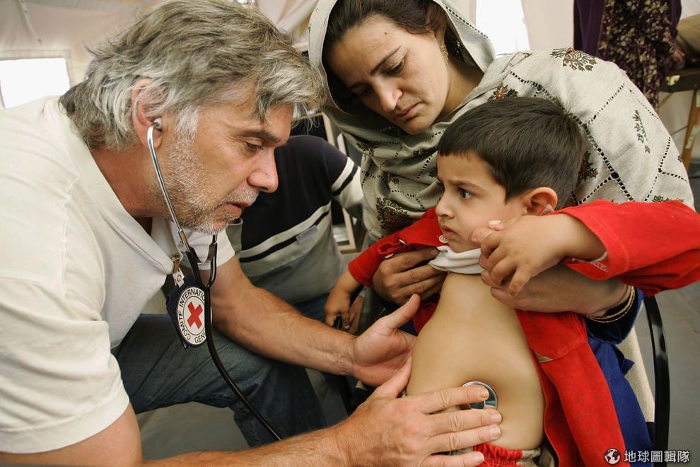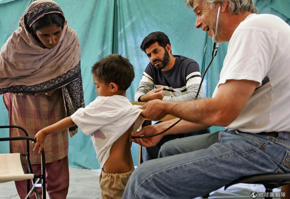 照片中是德國籍的醫生,正在幫小男生檢查健康狀況。2005年的巴基斯坦受到南亞大地震的影響,當地有許多居民失去家園,當時聯合國就呼籲各界注意山區中的居民的景況,因為地震讓居民失去家園,他們面臨了冬天失溫致死的危機。