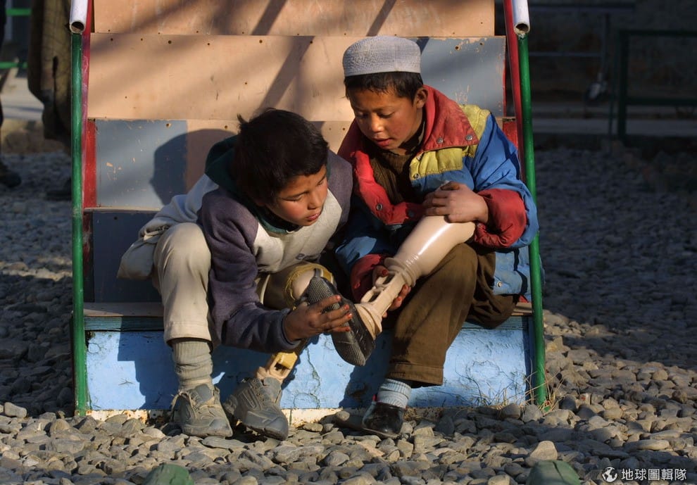 當地2位因地雷炸斷腳的小朋友,正在看著紅十字會資助他們的義肢。