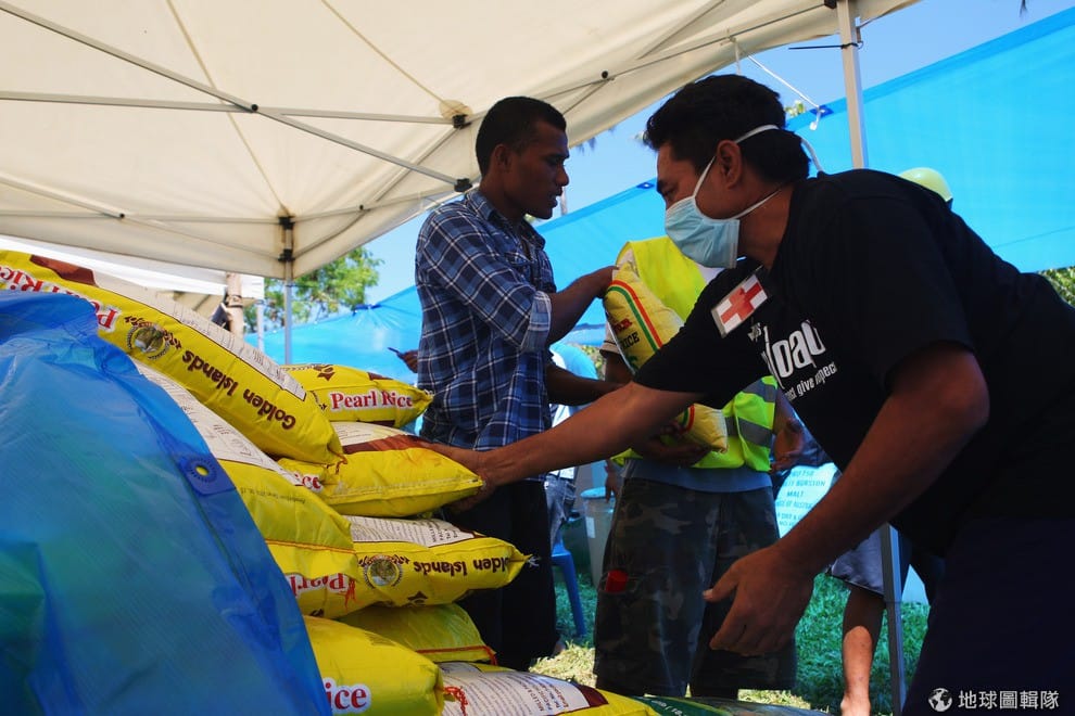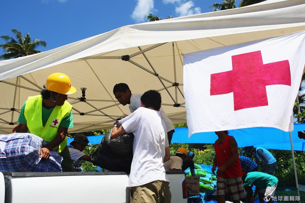 2009年當地發生規模8.3的大地震,照片中是當地的物資中心,志工們正在把瓶裝水和米整理打包。