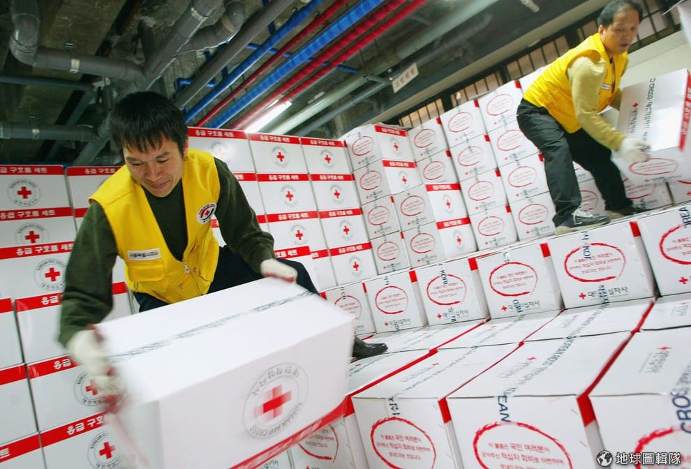 南韓當地的紅十字會志工,正在把裝箱的物資整理好準備送往北韓。北韓發生嚴重的火車爆炸意外,這些物資將運往當地協助傷患,物資中包含了醫療用品、瓶裝水、毛毯、急救箱、泡麵和衣物等等。