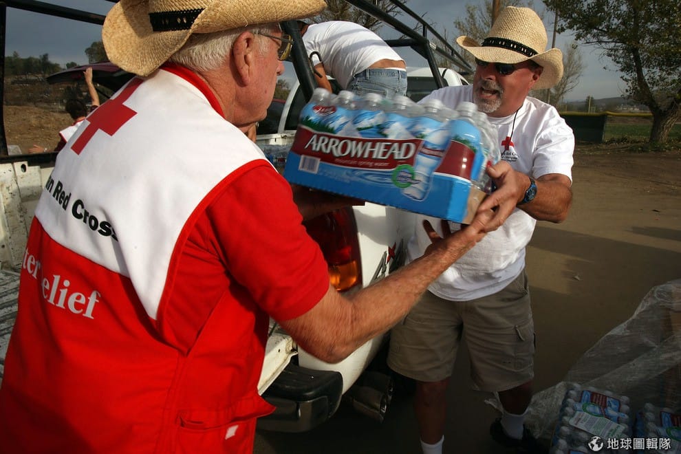 2007年加州發生大火意外,當地重要的飲水管線受影響,民眾無水可喝。志工正在把瓶裝水分派給居民。