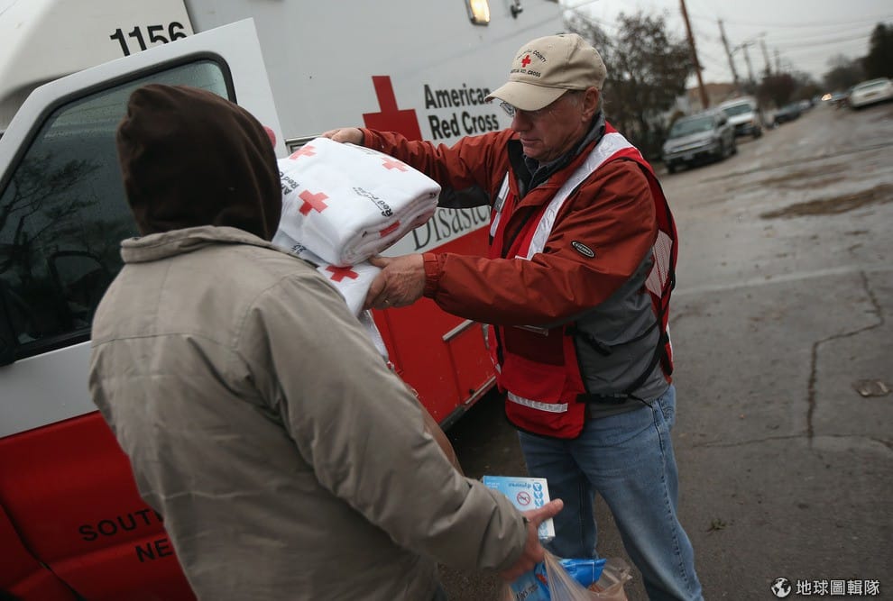 2012年颶風珊迪重創美國東岸,許多人失去家園更要面對寒冬沒有暖氣的窘境。照片中的志工正在把毛毯遞給民眾。
