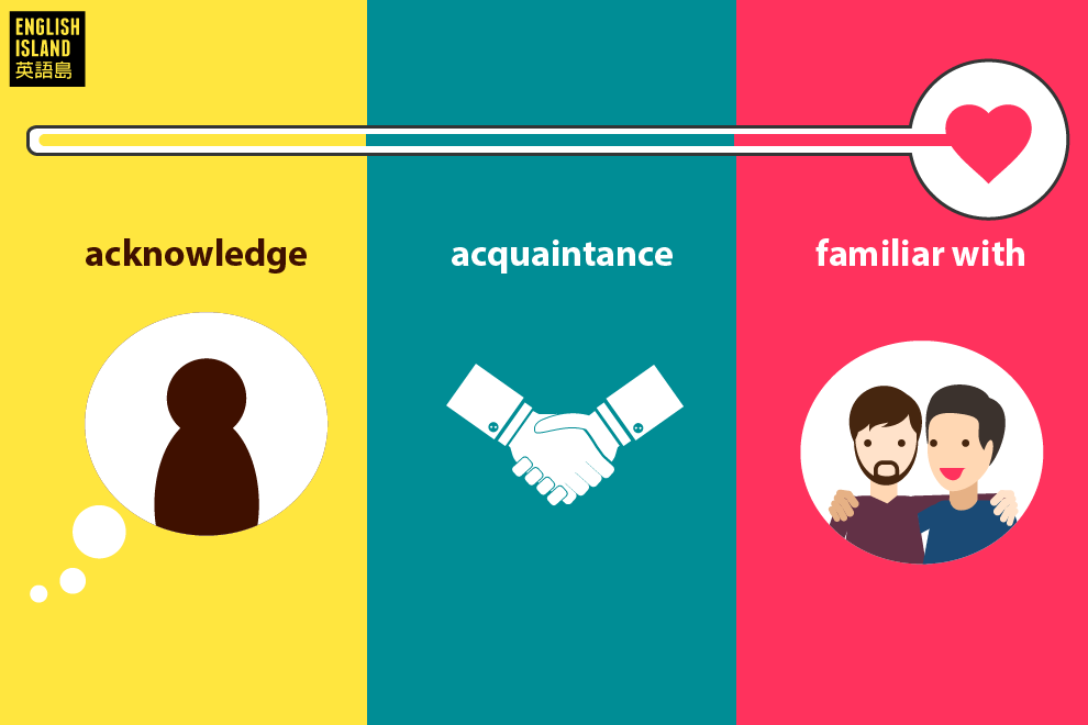只知道此人存在的英文可以用"acknowledge",可能見過面但沒深交的,英文稱之為"acquaintance"。還有最簡單的一個字叫做"know"。"Know"的「認得」可深可淺,要問人跟David熟不熟,老外大都會說:Do you know David (well)?