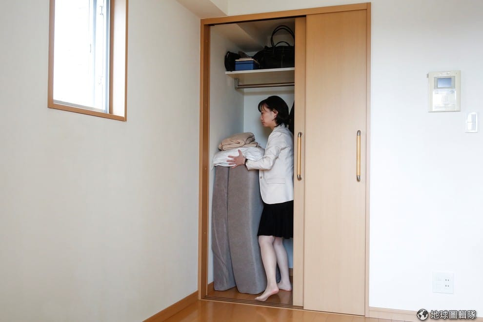 躺在 22平方公尺室內的,是現年 22歲的豐田克也,他向記者示範自己平時睡覺時候的習慣。受訪時,他回想自己是在搬家時產生了想要轉為極簡生活的念頭:「搬家時,我很驚訝自己有這麼多東西,…時間流逝中,人們買東西又丟掉東西,(對東西)毫無感覺」。