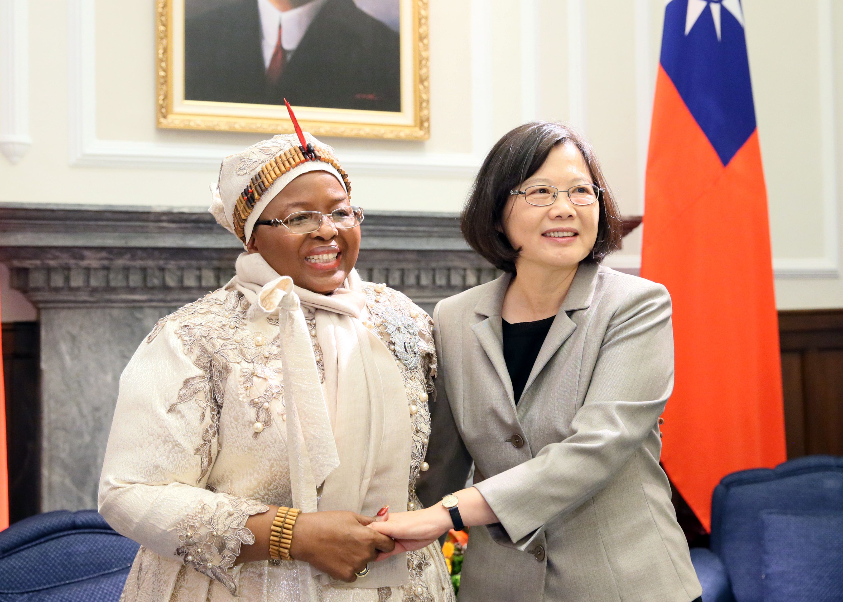 路透社台灣人到邦交國史瓦濟蘭不用簽證,到非洲其他 18國也只需落地簽,比大多數非洲人出入都還要方便。圖為台灣總統蔡英文接見史瓦濟蘭王國國母恩彤碧陛下。