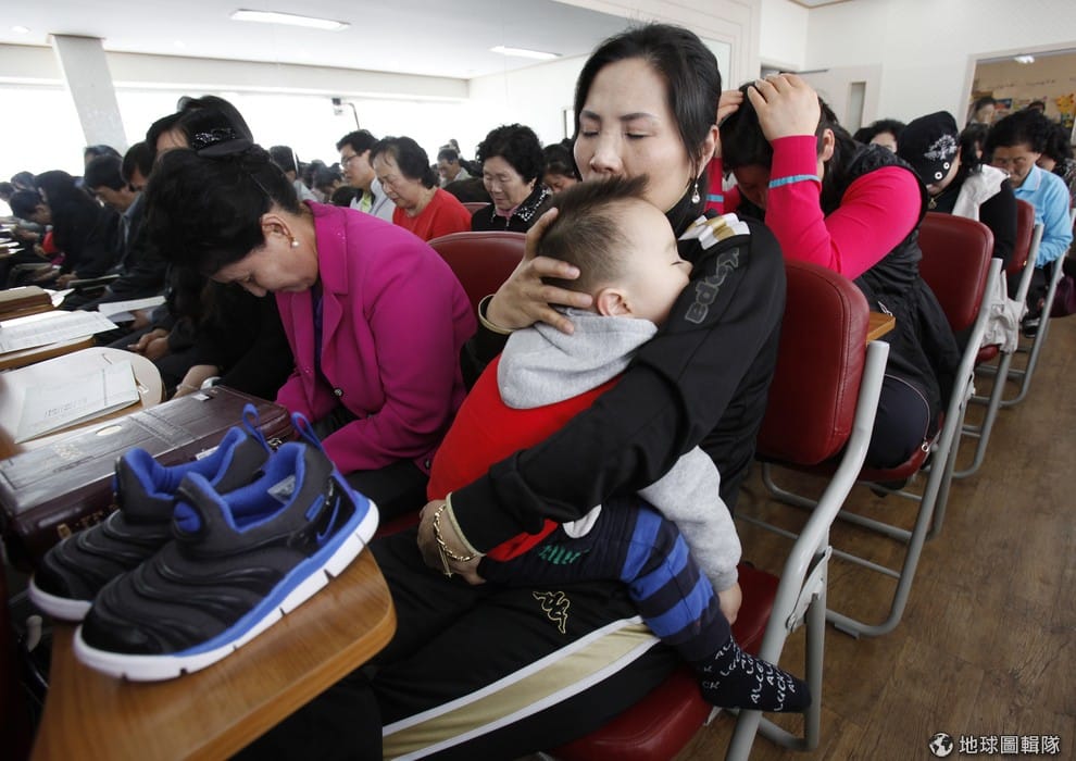 路透社在南韓的教堂內,一名抱著小孩的脫北者為北韓的人權禱告。