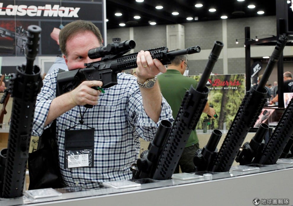 每年,全美步槍協會都會舉辦大型展覽會展出精良的槍枝,圖為一名男子正在展覽會上把玩槍枝。