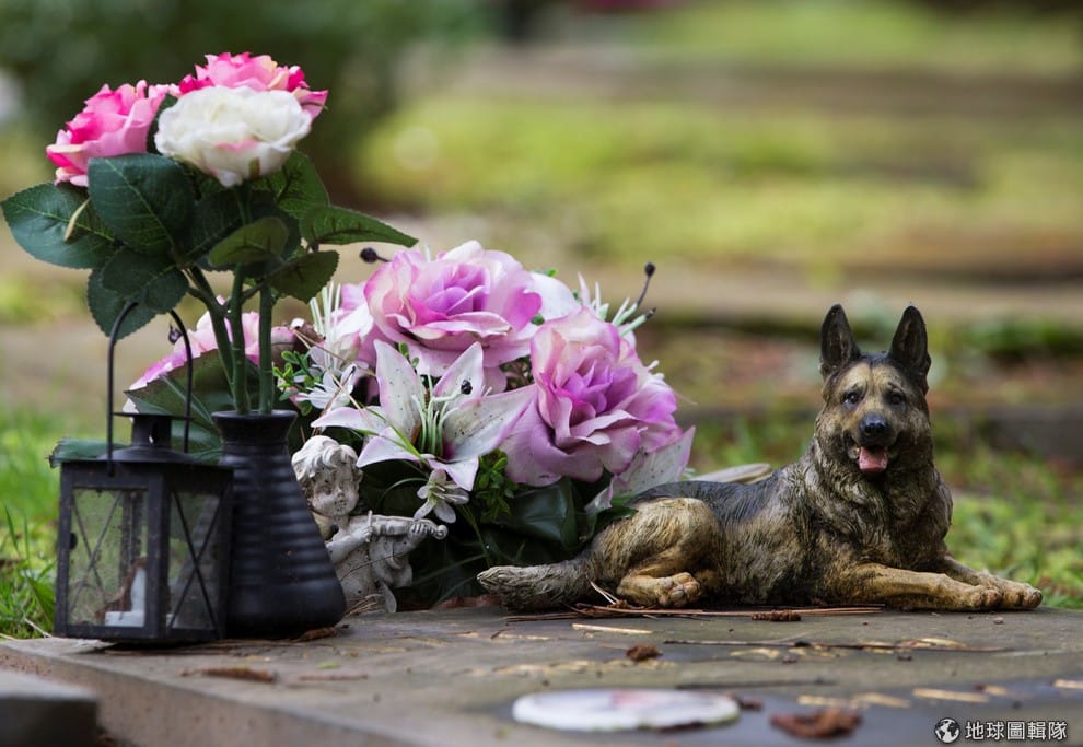 路透社艾瓦耶當地,一處寵物墓園中可見鮮花和模仿動物外貌的雕像。
