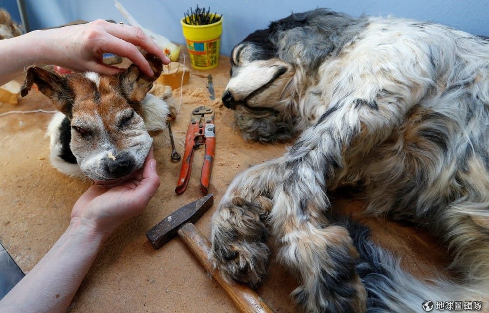 路透社店長潘德維爾舉著狗兒標本,他希望「動物變」這家店能讓寵物有尊嚴地離世,同時也提供主人和毛孩們之間的愛另一種延續下去的方式。