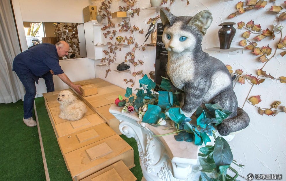 路透社店長潘德維爾正在一一確認能放入毛孩的棺木。