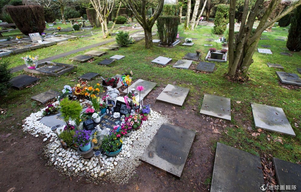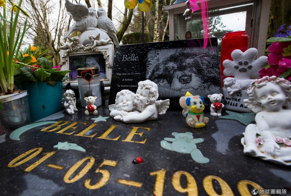 路透社叫做貝兒(Belle)的狗狗墓前有著鮮花、相片以及精美的天使雕像。