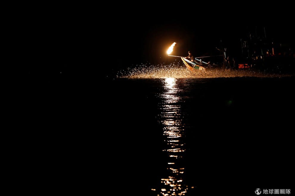 青鱗魚受到驚嚇,成群從海中躍起,在火光的照映下形成奇幻的景致。