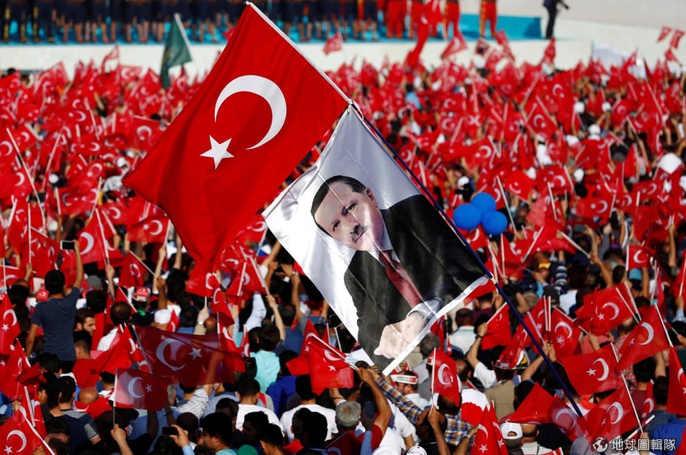 支持土耳其總統埃爾多安的民眾,揮舞著用他的肖像做成的旗幟,上街參加第 563屆鄂圖曼土耳其帝國征服伊斯坦堡大遊行。