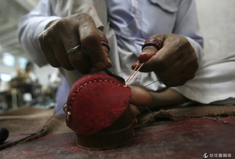 客家人在印度加爾各答從事皮革業已經100多年,現在雖僅存45家,但都是體質強健的企業。上圖為正在縫製皮革的印度工人。