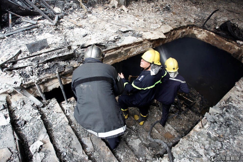消防人員走入已經被炸得焦黑的商場大樓中。