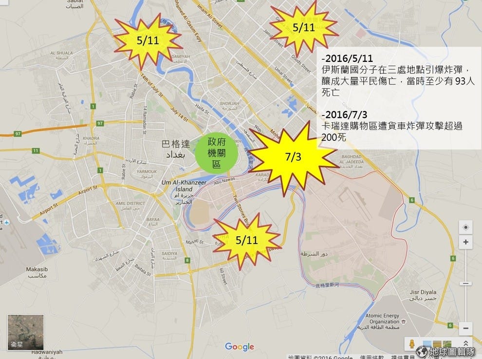 《半島電台》、NPR綜合報導,伊拉克再傳重大恐怖攻擊,伊斯蘭國(IS)在首都巴格達充滿人潮的購物區使用汽車炸彈,釀成重大死傷,目前已知死亡人數超過 200人,官方擔憂隨著越來越多罹難者遺體被挖掘出來,死亡人數將持續增加。