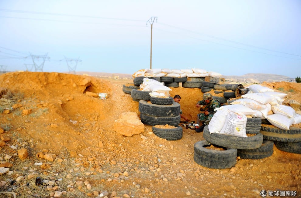 路透社敘利亞:正在站崗的一名軍人藏身輪胎後。