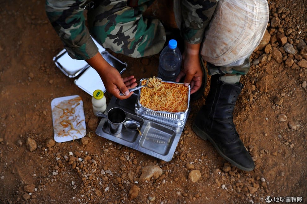 路透社站崗的敘利亞軍人正在享用他這一天的開齋飯。
