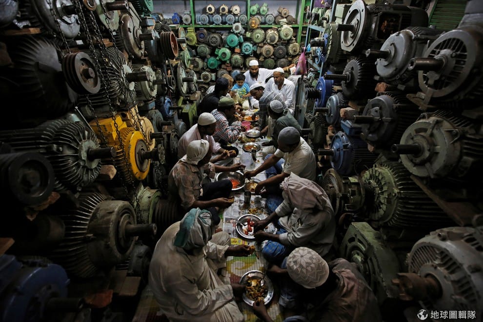 路透社印度:35歲的胡薩因(Anwaar Hussain)和員工們待在德里的店內享用開齋飯,這家店主要提供二手電器和幫浦。