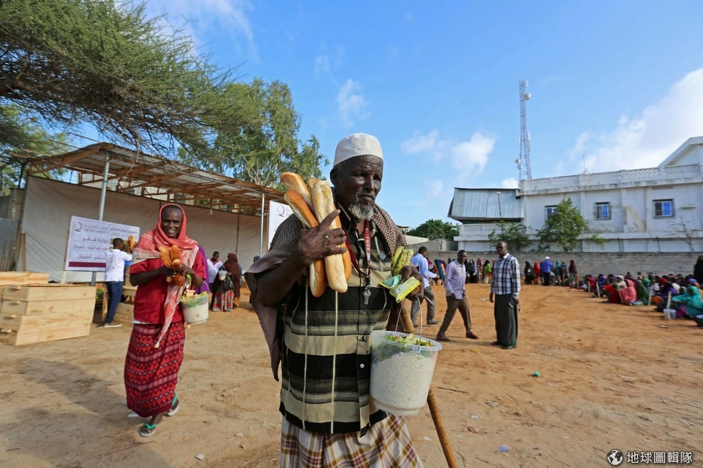 路透社索馬利亞:78歲的哈珊(Abdi Hasan)抱著剛剛領到的食物前行。