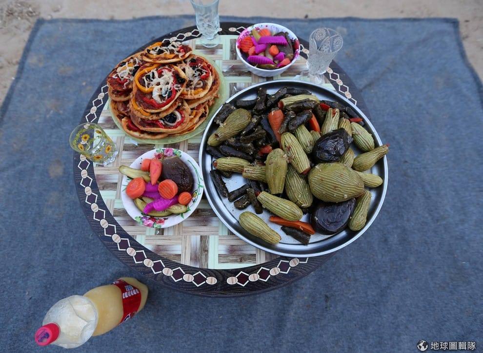 路透社加薩走廊的開齋飯,由麵包、蔬菜和小黃瓜等醃漬物組成。