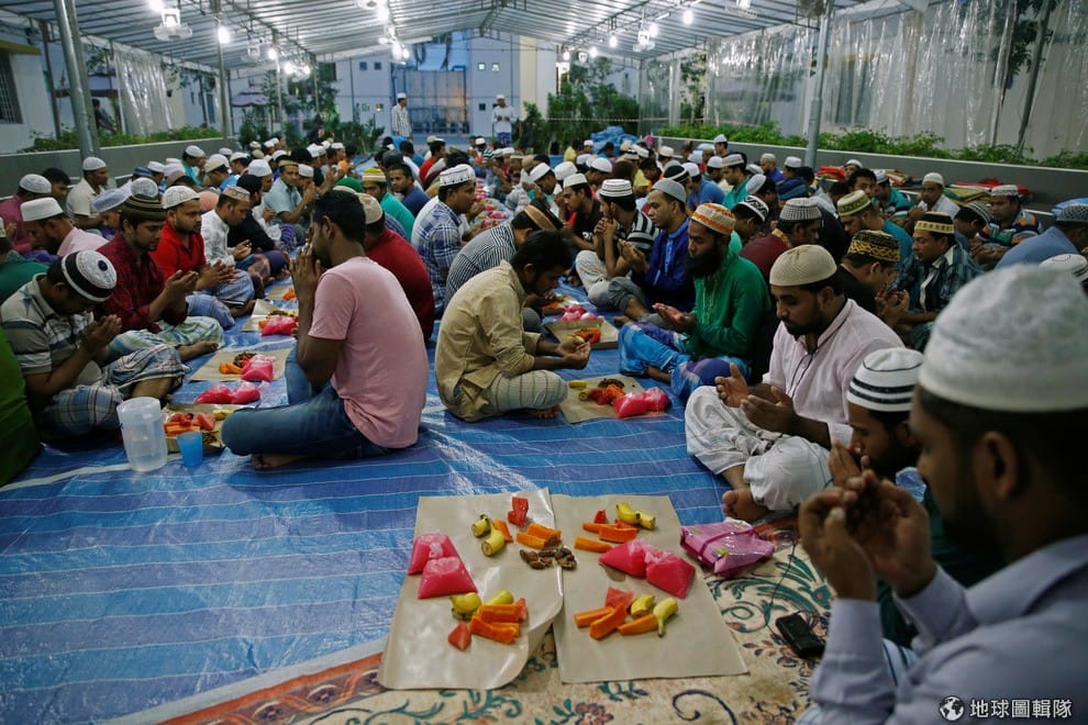 路透社新加坡:孟加拉勞工們坐在宿舍區內享用開齋飯。