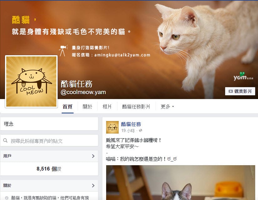 合作夥伴「酷貓任務」的Facebook專頁,每天都有可愛的酷貓照片或影片。