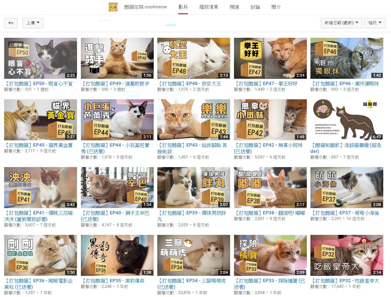 目前「酷貓任務」的Youtube頻道中光是有關殘缺貓的影片已經超過 50支,除了可愛的酷貓外,還可以發現有許多關於貓咖啡以及貓知識的影片。