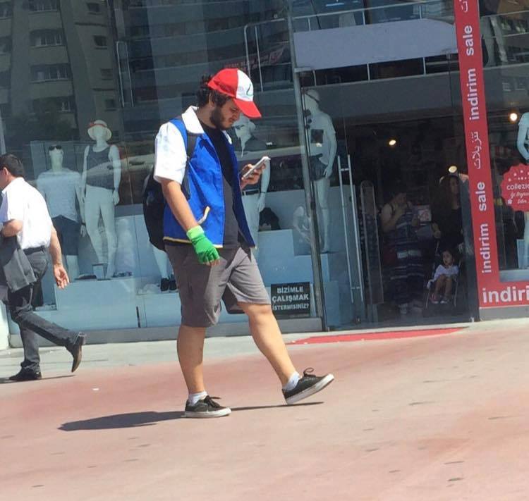 一名玩家打扮成《精靈寶可夢》主角小智的模樣,在街上尋找精靈寶可夢的蹤影。